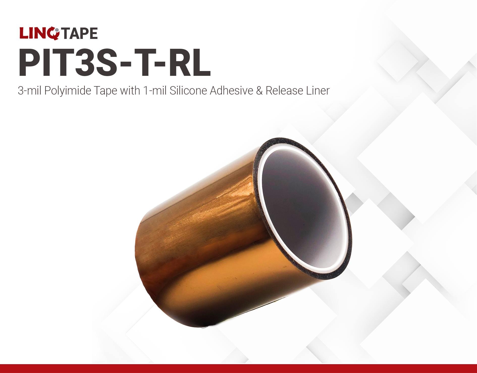 LINQTAPE™ PIT3S-T-RL tapes are high performance, temperature resistant polyimide tapes that use a polyimide film as a backing film. This flame retardant backing film is the generic version of DuPont's Kapton HN film and has a thickness of 3mil (76.2µm). Laminatedon it is a 1mil (25.4µm) thick pressure sensitive silicone adhesive making the total thickness of the polyimide film plus adhesive only 4mil (101.6µm) thick. PIT3S-T-RL remains both electrically and mechanically stable across temperatures ranging from -269°C to 400°C (-452°F to 752°F).