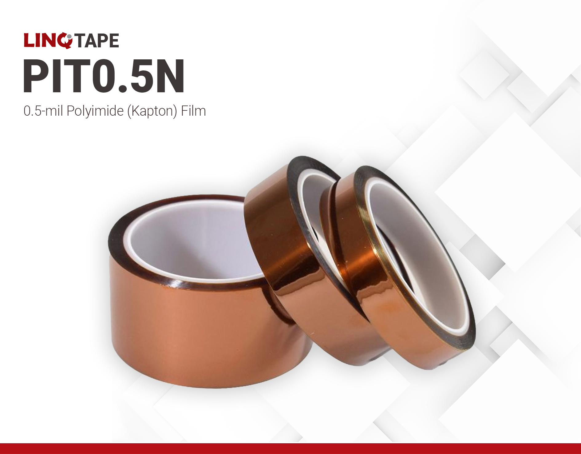 LINQTAPE™ PIT0.5N Film comes in 33-meter (36-yard) rolls of varying widths. LINQTAPE PIT-N polyimide films without adhesive are available in a range of thicknesses, starting from 0.5 mil (12.7µm) thickness and up. Custom thicknesses are available upon request.