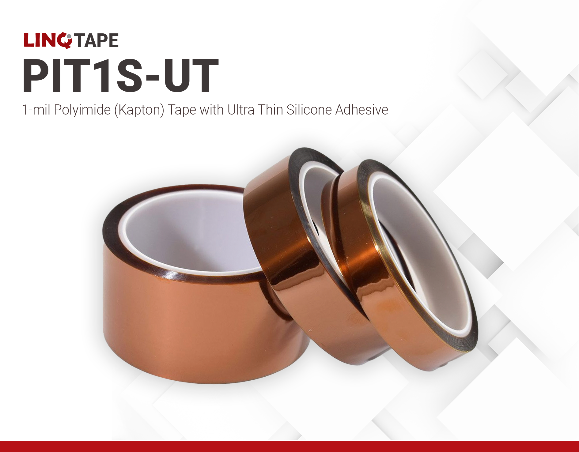 LINQTAPE™ PIT1S-UT Series comes in 33 meter (36 yard) length rolls of varying widths. The base polyimide film (backing) thickness is 1 mil (25.4 ± 2µm) thick and the total thickness including the adhesive layer is approximately 1.5 mil (38.1± 2µm).