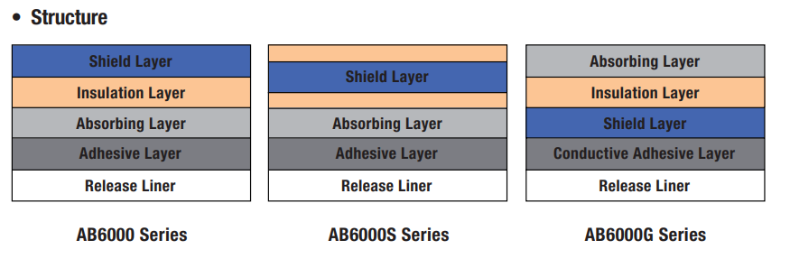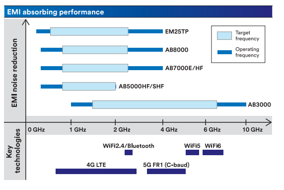| AB6000HF / SF Series | <18 GHz | Hybrid absorber for high-frequency EMI; combines metal shielding and absorbing layers; sheets and rolls; easy application with PSA |