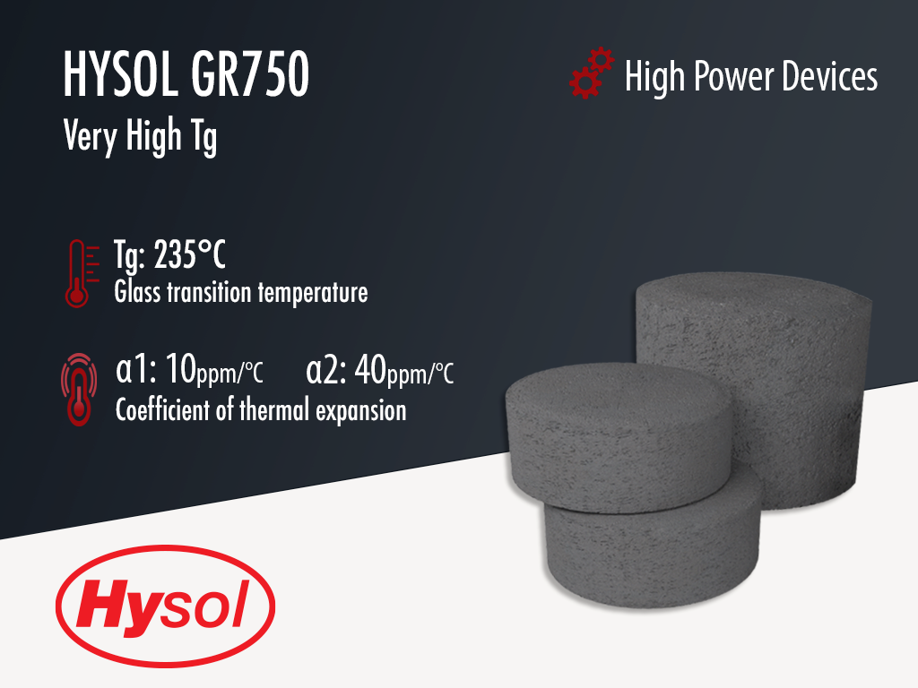 Hysol GR750 is a halogen free, black, silica filled (75um cut size) semiconductor grade epoxy molding compound. It offers an extremely high Tg (235°C) along with low moisture absorption, low viscosity and excellent adhesion to Nickel (Ni) leadframes, only to be beaten by GR750 X1 (194N tab pull). The GR750 product series has been developed with 3rd generation semiconductors in mind and is the product of choice for Silicon Carbide (SiC) and Gallium Nitride (GaN) packages.
