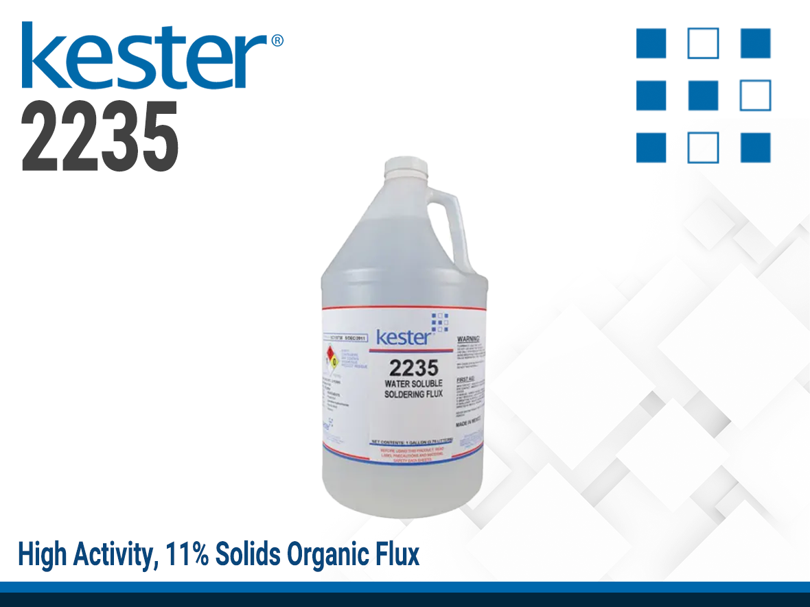 KESTER 2235 is a high activity 11% solids organic flux designed for automated soldering of circuit board assemblies where a more aggressive flux is required, but reliability considerations are paramount. 2235, a flux with comparably low solids in respect to other fluxes in the same category, will produce fewer skips on the bottom side surface mount pads. The residue after soldering is effectively removed in standard water cleaning systems. Although possessing high activity, boards exhibit high ionic cleanliness after water cleaning, exceeding the requirements of MIL-P-28809. No offensive odors or excessive smoke are emitted during soldering. The flux will not create excessive foaming in standard water cleaning systems. 2235 is classified as ORH1.