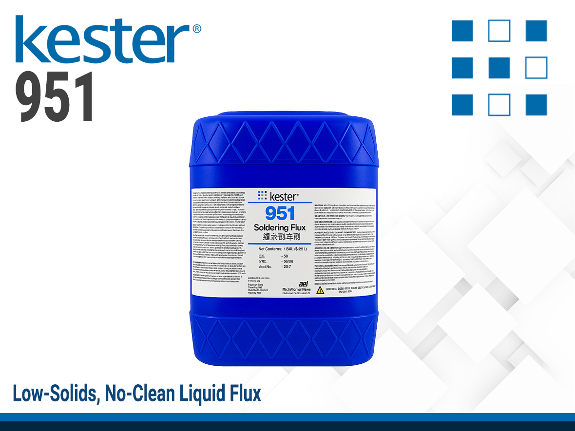 KESTER 951 is a zero-halogen, non-rosin flux engineered for high-reliability soldering processes, including wave soldering and for use on conventional and surface mount circuit board assemblies. Its extremely low solids content (2.0%) and unique activator system ensure practically no residue is left on the assembly after soldering. Boards exit the wave solder machine dry and cosmetically clean. This "no-clean" formulation eliminates residues that could interfere with electrical testing.