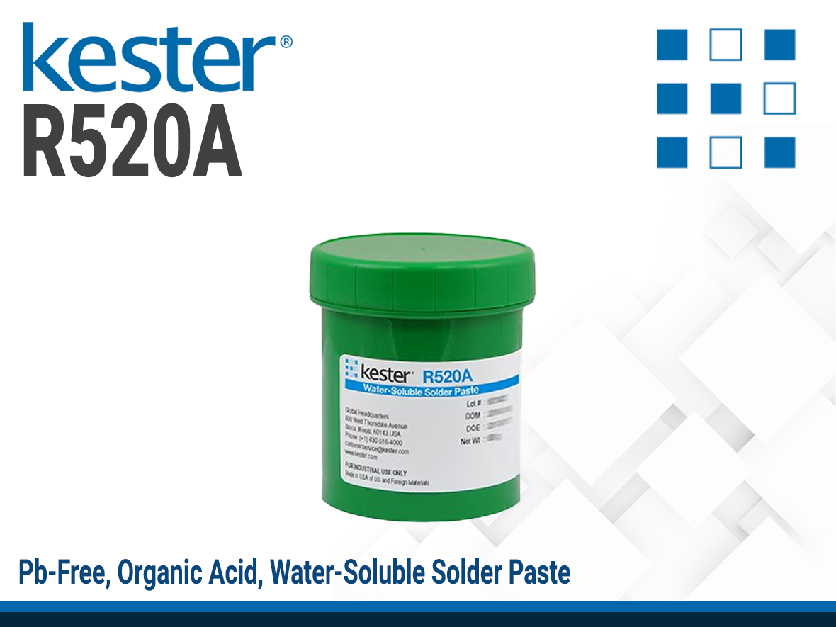 KESTER R520A is a lead-free, organic acid, water-soluble solder paste formula specifically designed for use with the higher temperature Pb-Free alternative soldering alloys such as Sn96.5Ag3.0Cu0.5 (SAC Alloys). The solder paste exhibits long stencil life and tack time, while still delivering exceptional solderability to a wide variety of metallic substrates. R520A was formulated to release consistently from the stencil for those critical fine pitch applications (0.5 mm/20 mils) with anti-slump characteristics and preferred solder deposit definition. The activator package in this formula is extremely aggressive, providing superior wetting to OSP coated and Immersion Gold over Electroless Nickel (ENIG) boards. R520A is an extremely stable water-soluble formula.