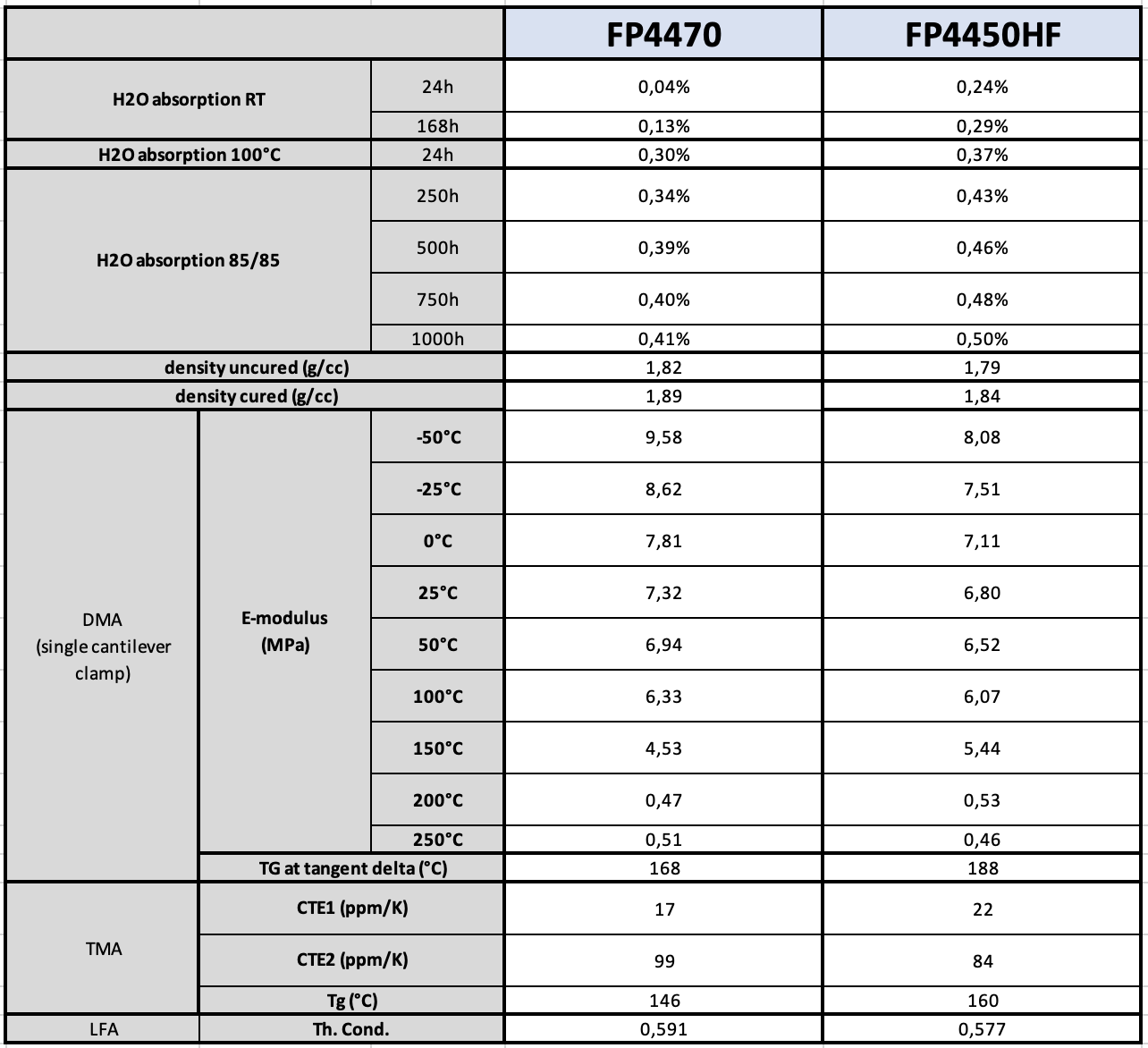 FP 4470 uses the same hardener system as 4450, but the epoxy/anhydride resin system is slightly more different compared to FP 4450(HF). Tg is lower and 4470 has few % higher filler loading for lower CTE (19 vs 17ppm). FP 4470 also has smaller filler particle size (<50um) vs FP 4450 and higher adhesion vs FP 4450(HF).