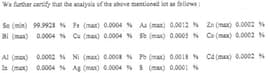Sn100 | Pb-free | 99.9928% min | - | - | - | - | - | 232 | - | - | 4N Pure Tin (>99.9928% Sn) | |||